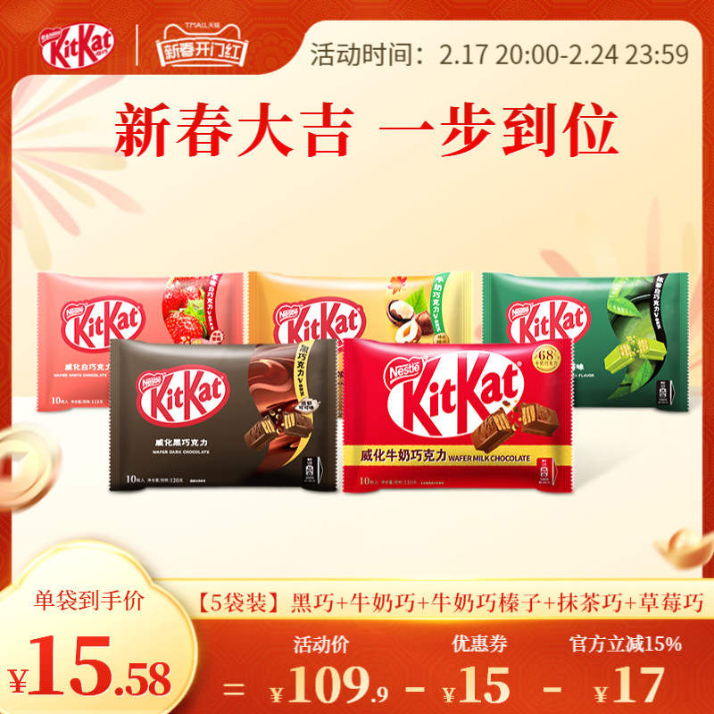 KitKat雀巢奇巧牛奶榛子抹茶黑巧克力零食120g*5夹心白巧休闲礼物