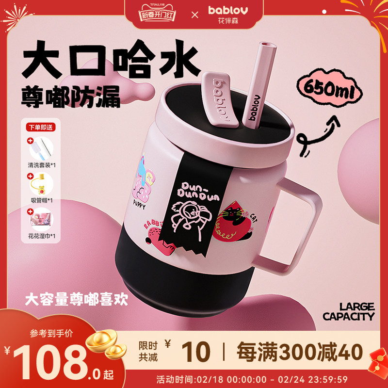 bablov保温杯女生高颜值大容量泡茶礼物杯子不锈钢咖啡带吸管水杯