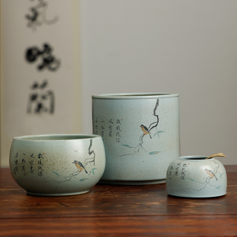 匠人手绘枝头鸟大笔洗 仿古瓷器摆件景德镇陶瓷中式文房洗缸陶瓷