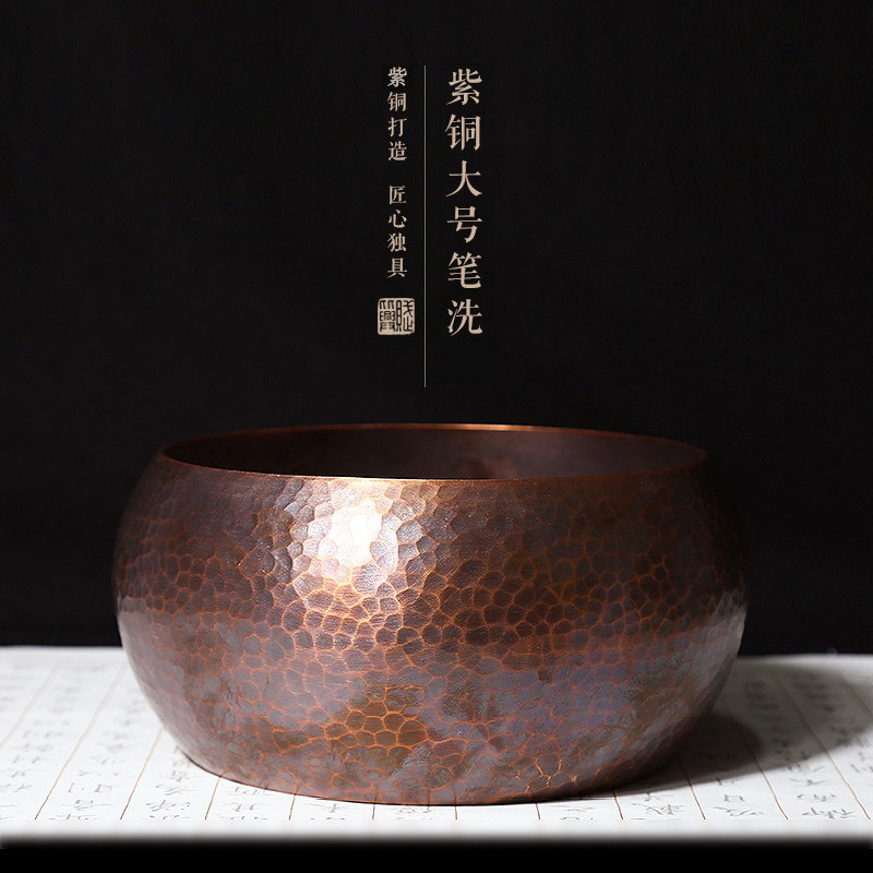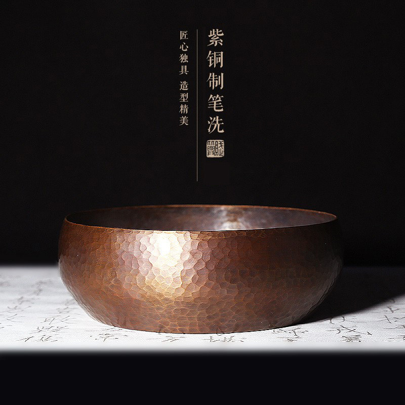 赋比兴 紫铜锤纹毛笔洗水盂 手工复古文房四宝铜器 紫铜茶洗建水国画笔洗缸 墨斗盛墨汁墨碟多用陶瓷墨盒