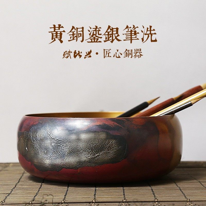 赋比兴 国家非遗 鎏银紫铜笔洗 大号笔洗 高温鎏银 手工古法铸铜工艺 手工黄铜茶洗国画笔洗缸 手工铜器礼品