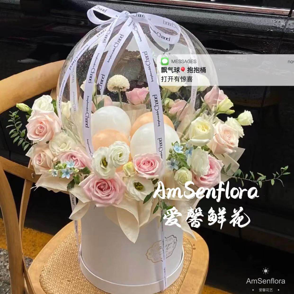 粉玫瑰抱抱桶氦气飞空气球飘升气球鲜花惊喜鲜花神秘礼物生日鲜花
