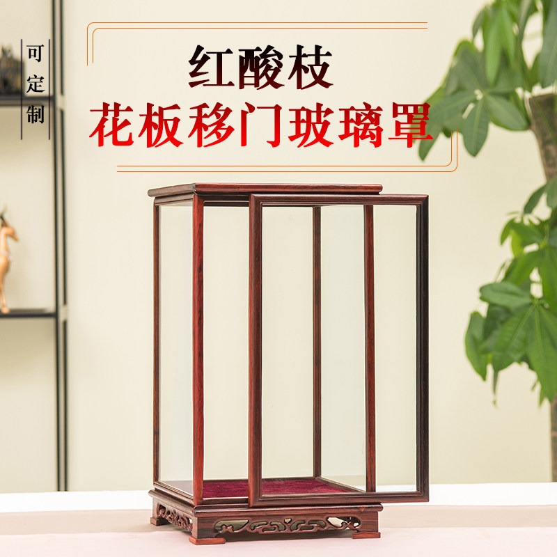 红木雕刻宝笼玻璃罩浮雕水浪工艺品佛像花瓶古董透明展示罩防尘罩