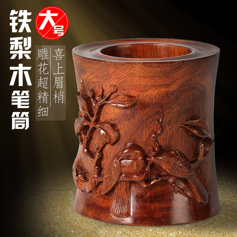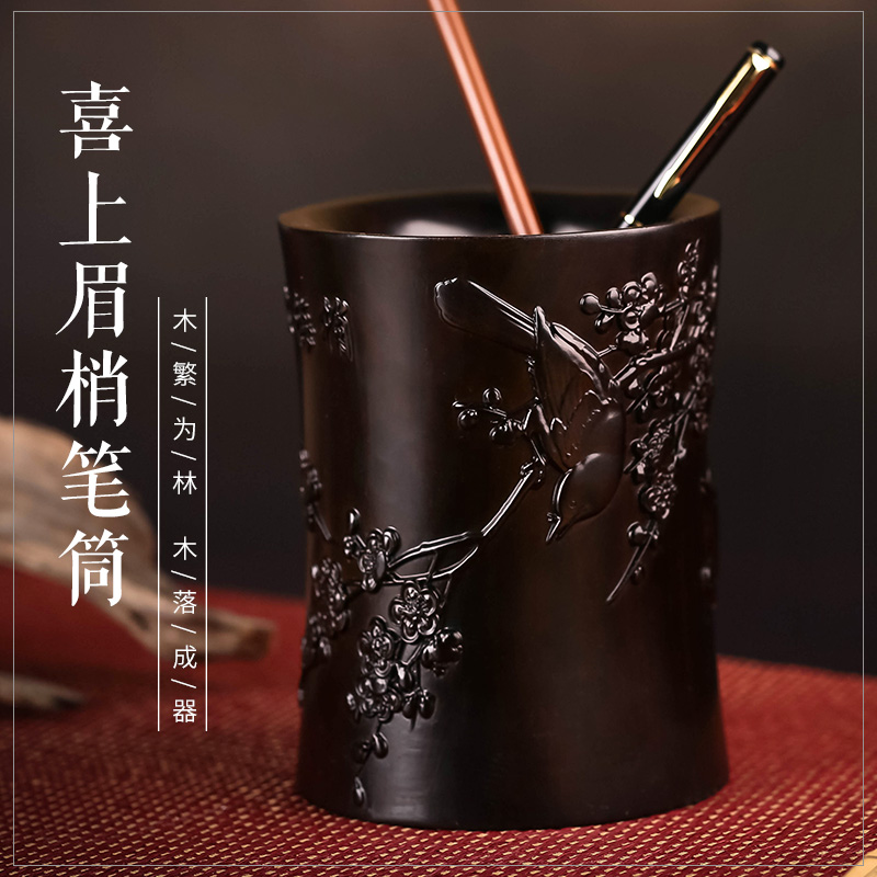 红木浮雕刻笔筒工艺品摆件木雕刻实木黑檀木质喜上眉梢办公室笔筒