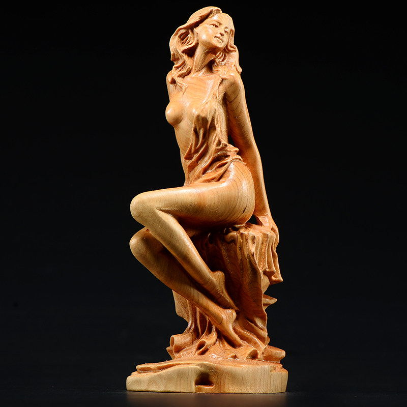 崖柏木雕美人出浴摆件实木头根雕刻美女人物红木质家居装饰工艺品