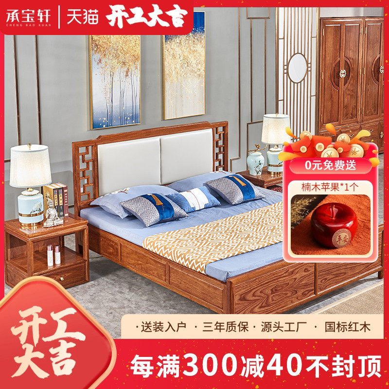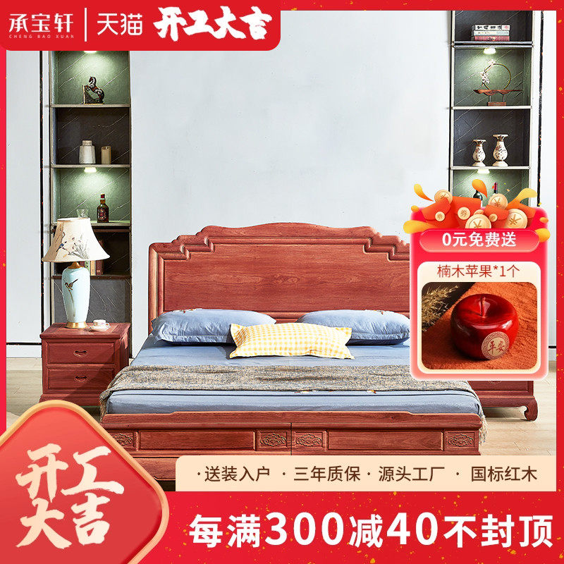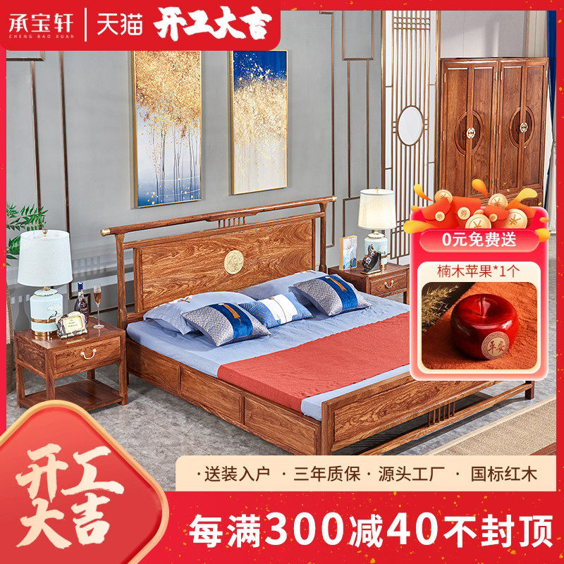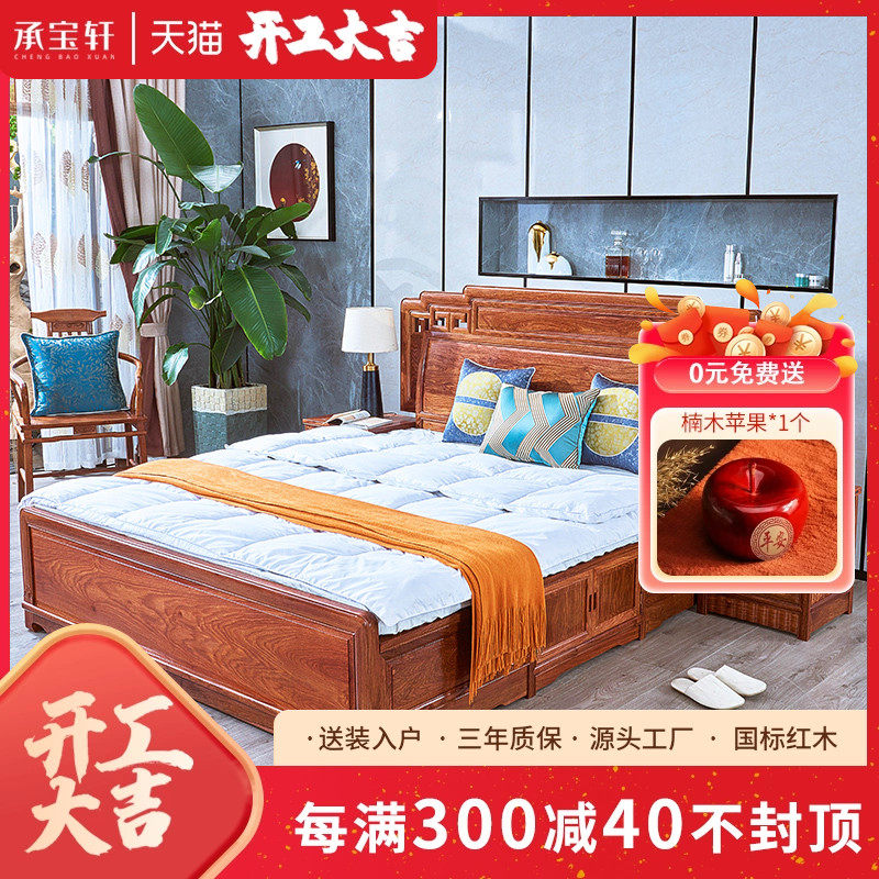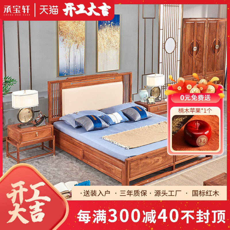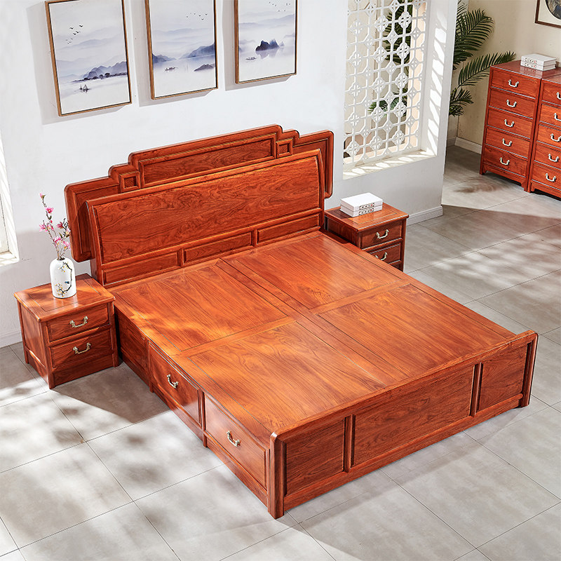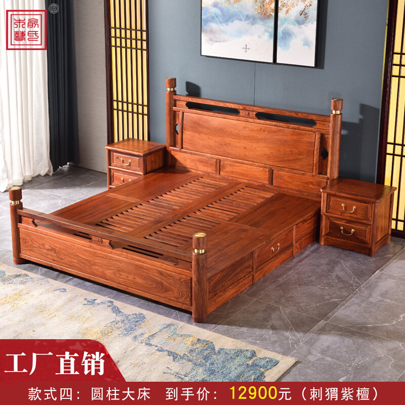 直销木果b果木 刺猬紫檀双人大床现代中式红木婚床花梨木抽屉收纳