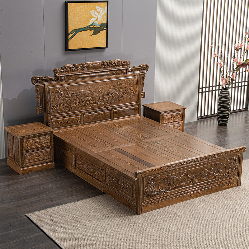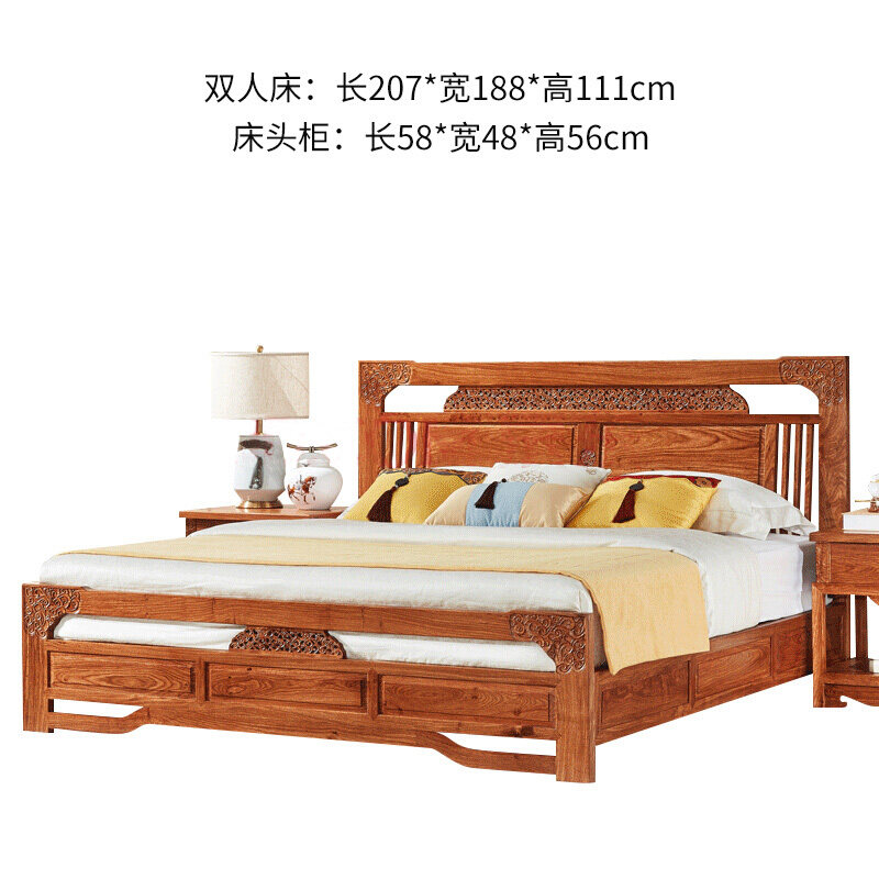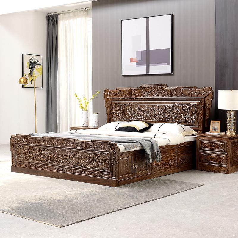 直销红木家俱鸡h翅木双人床1.8米新中式全实木床高箱床主卧室花鸟
