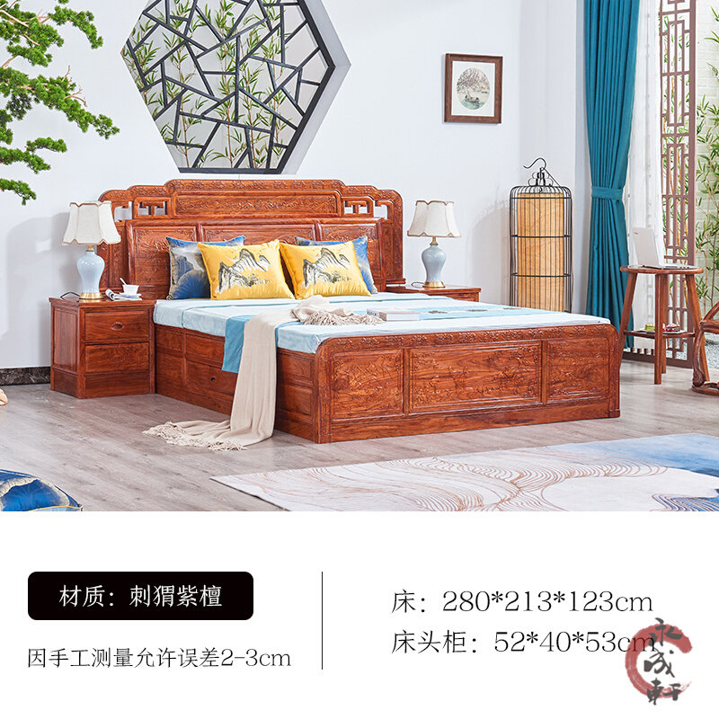直销现代花梨木新中式实木双人床刺猬紫I檀带箱体储物高箱红木雕