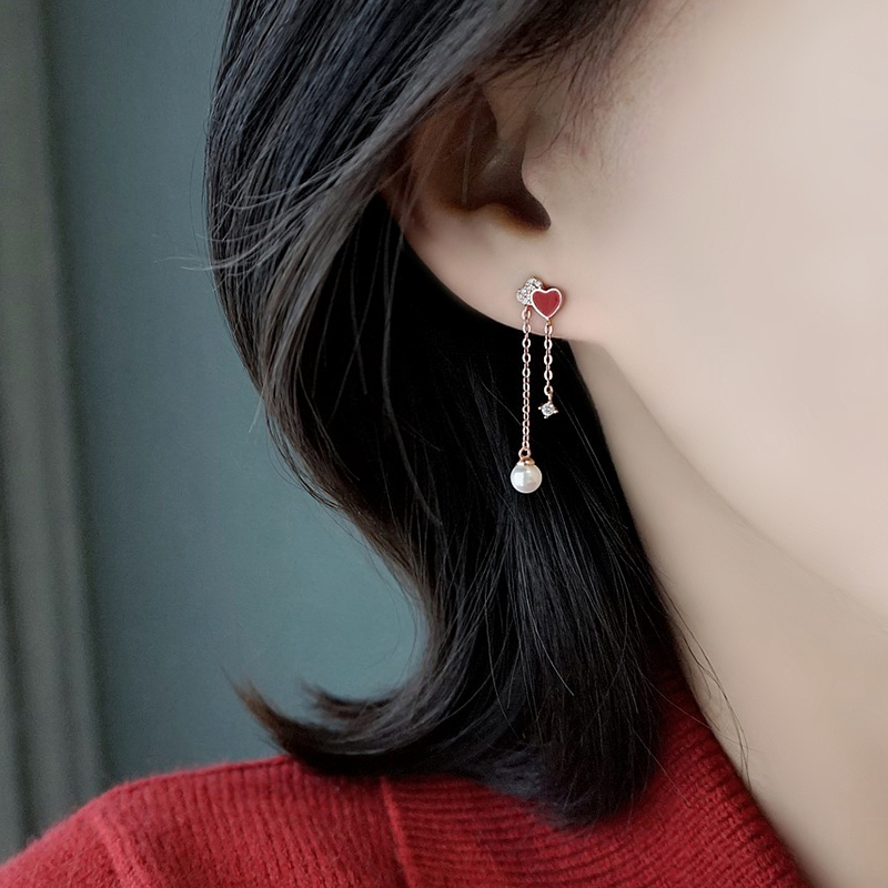 高级感s925纯银长款耳饰红色爱心耳钉针女珍珠耳坠流苏耳环气质
