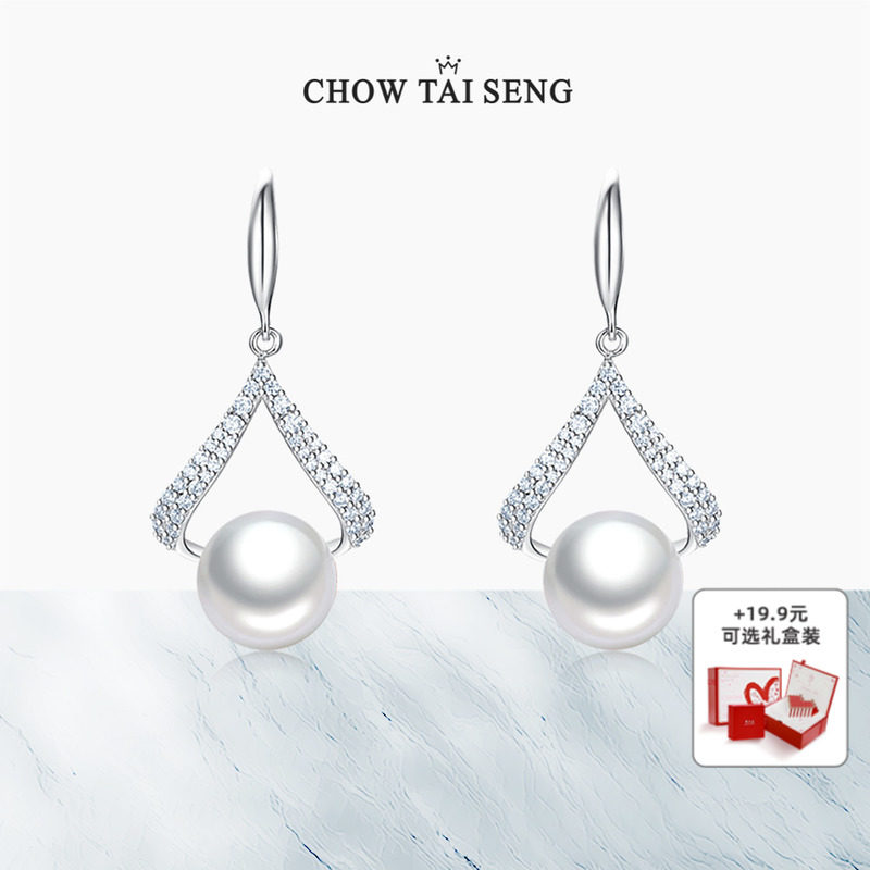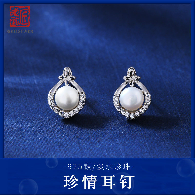周大生繁花四叶草珍珠耳钉女纯银花纹欧美复古轻奢精致感耳饰品