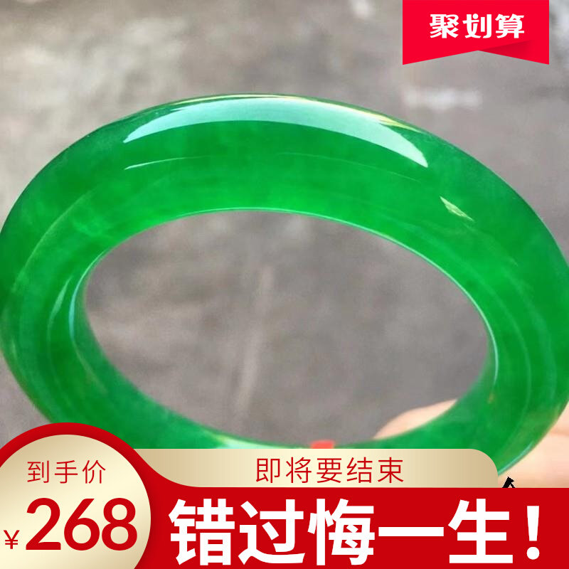 缅甸老坑冰种阳绿翡翠色手镯帝王绿宽版玉镯飘花圆条玉镯子少女款