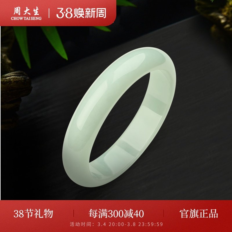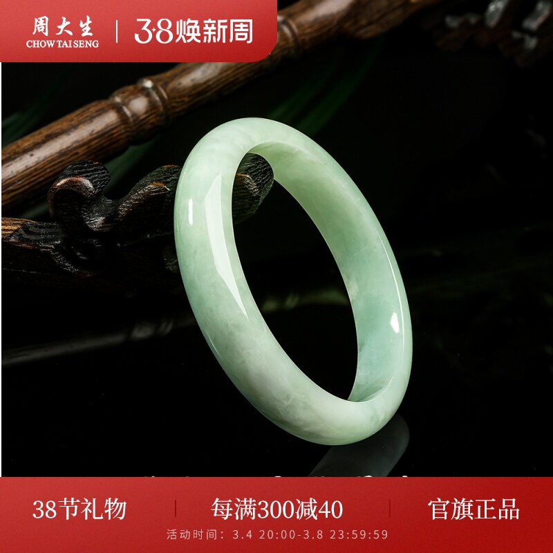 周大生天然正品翡翠手镯豆种白底平安镯女玉镯子送妈妈送女友礼物