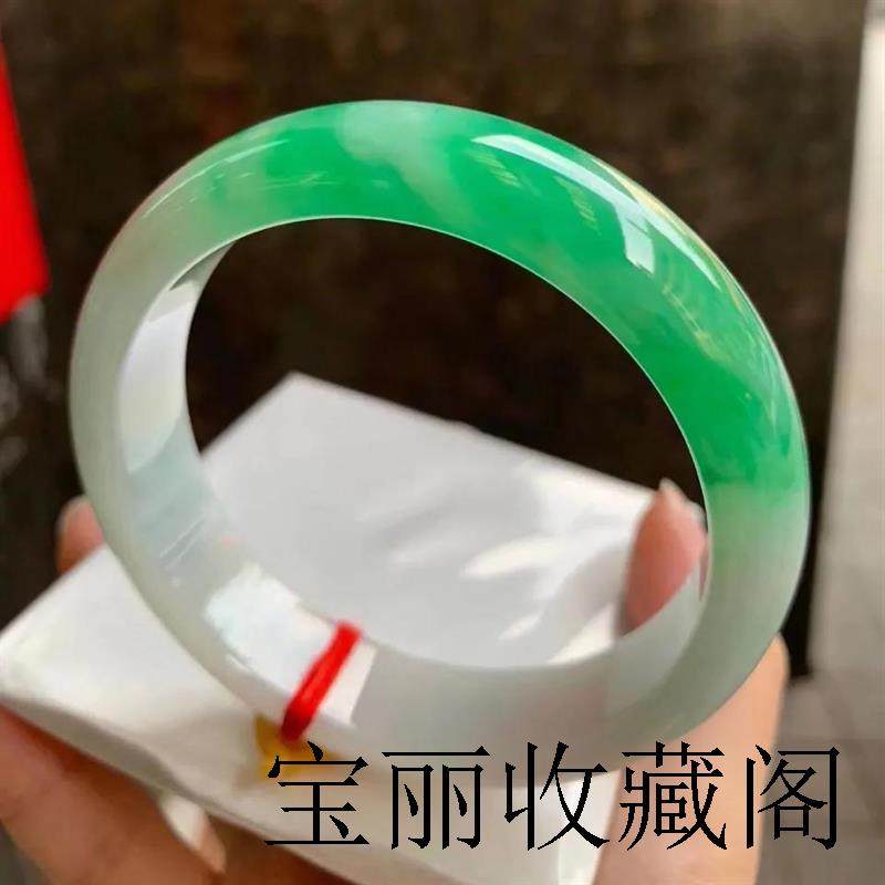 缅甸冰糯种翡翠色玉手镯女款半山半水阳绿飘花白绿正圈翡翠色精品