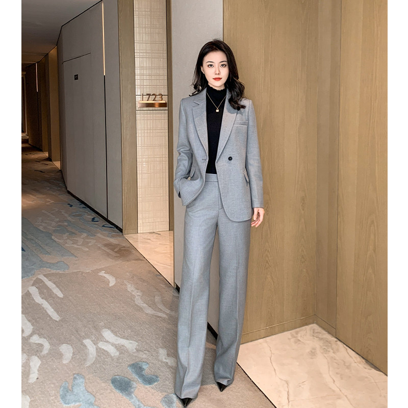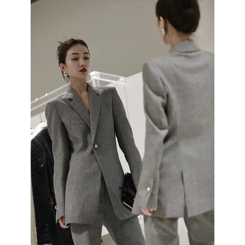 秋冬新款明星同款加厚灰色羊毛西装外套时尚气质职业阔腿裤套装女