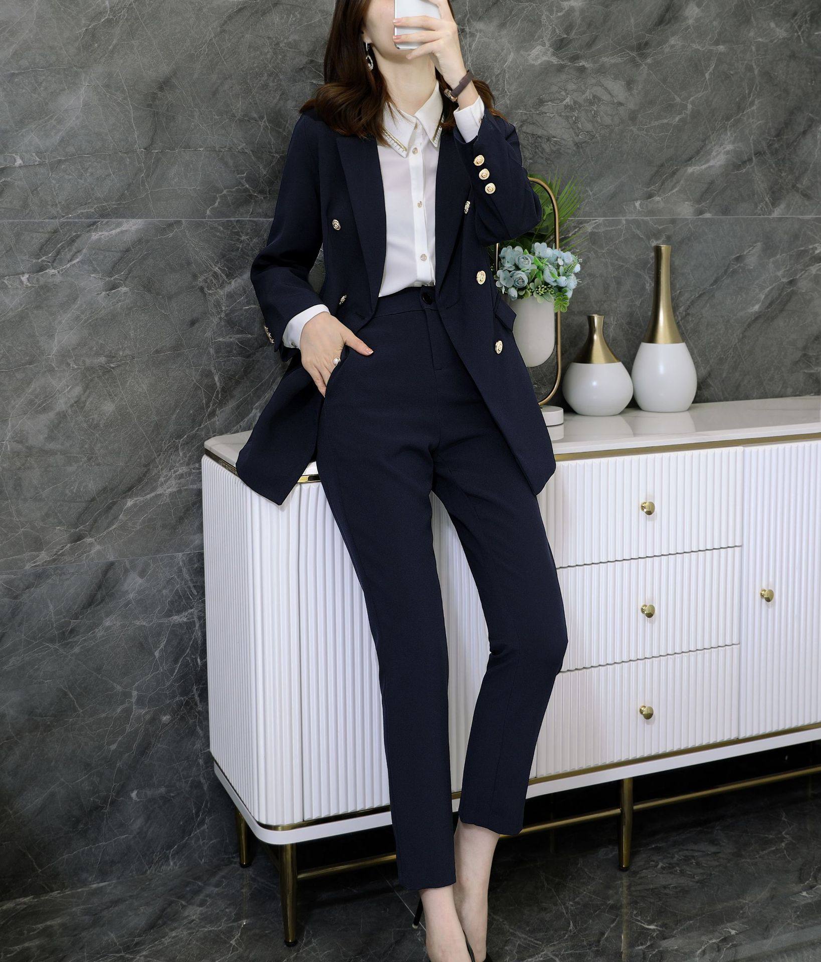 春秋冬欧美大牌藏青色职业西服外套修身团队商务西装小脚裤套装女