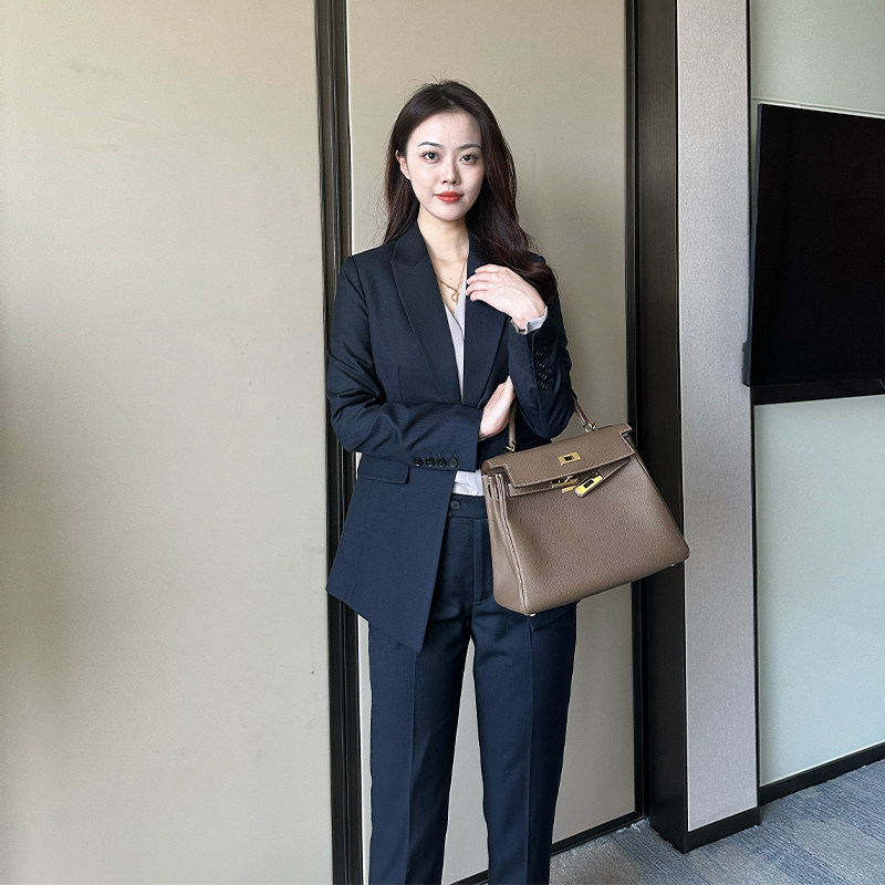 2023冬季新加厚羊毛人字纹藏青色高品质职业双排扣正装西装套装女