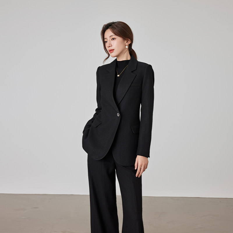 欧美秋冬新款黑色羊毛呢加厚一粒扣西服外套职业正装西装套装女
