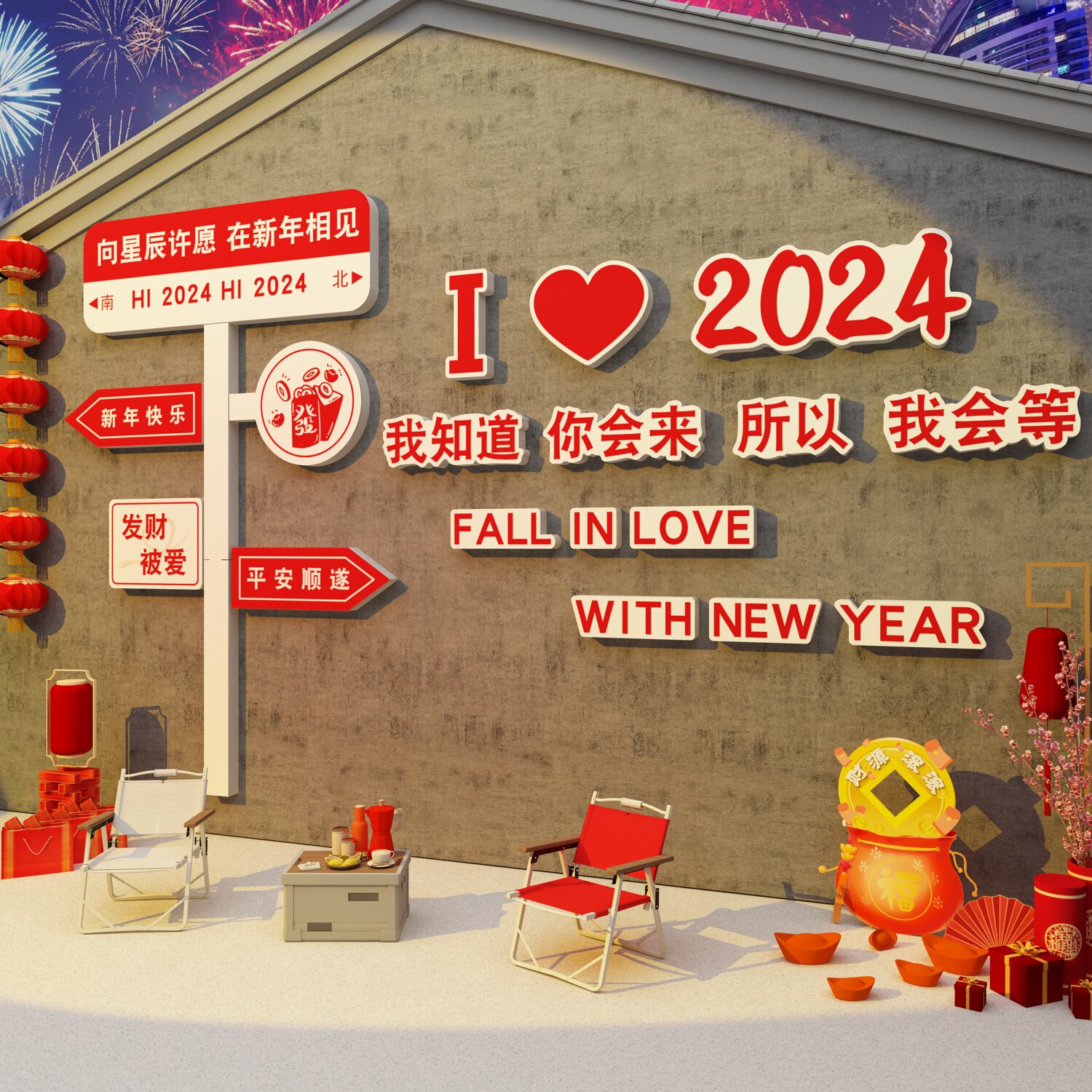 2024龙新年装饰过跨年氛围布置网红打卡拍照区路牌场背景墙面春节