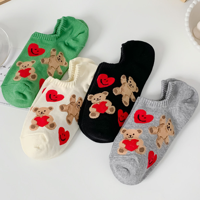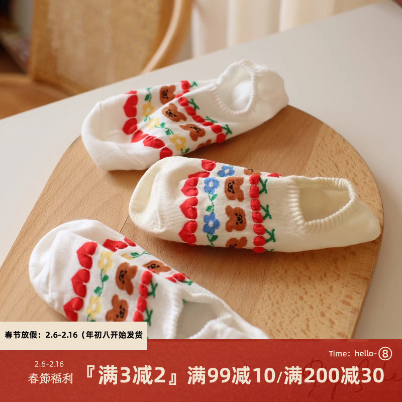 外贸货 卡通小熊少女船袜韩国爱心浅口透气防脱落纯棉隐形袜子