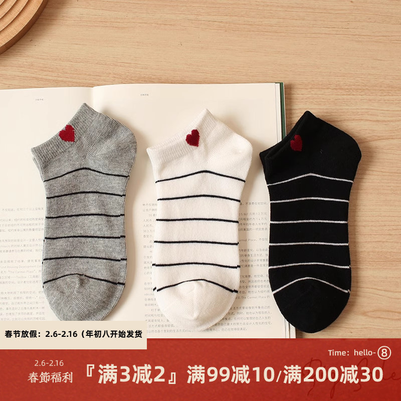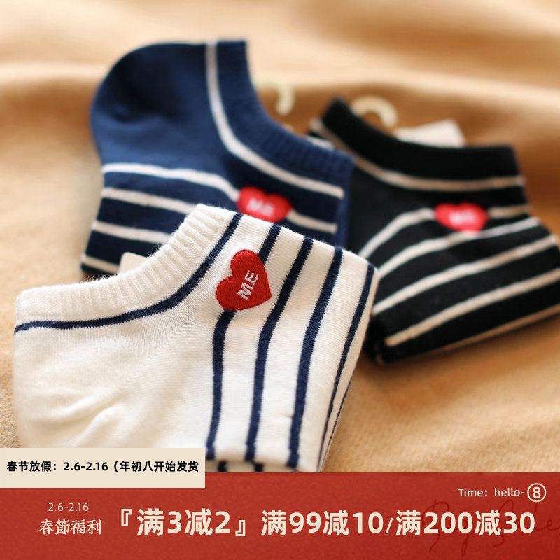 夏季条纹运动纯棉短袜韩版女士学院风袜子低帮浅口刺绣爱心船袜