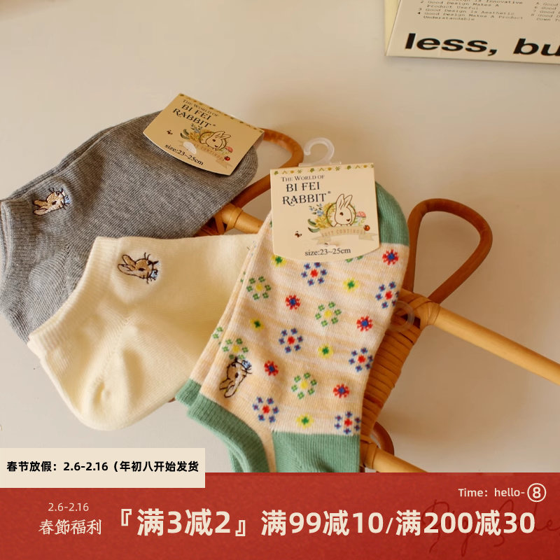日系ins田园风小碎花低帮浅口纯色船袜女刺绣兔子纯棉休闲短袜子