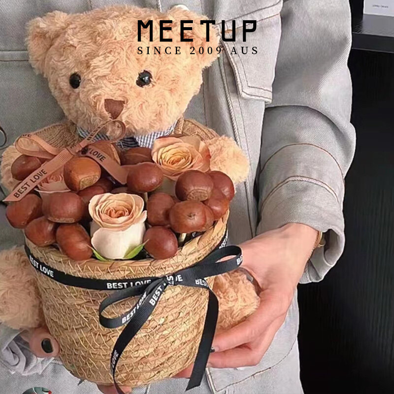 花与千荨 栗子抱抱熊草编花篮花束公仔玩偶生日毛绒玩具diy礼物