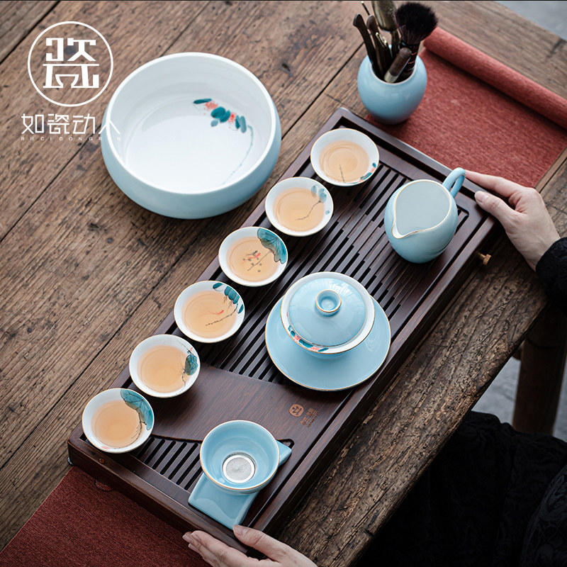 如瓷动人手绘功夫茶具套装家用简约陶瓷盖碗泡茶壶整套喝茶杯高档