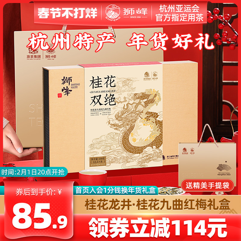 狮峰牌桂花龙井茶绿茶桂花九曲红梅红茶叶礼盒装送礼袋官方旗舰店