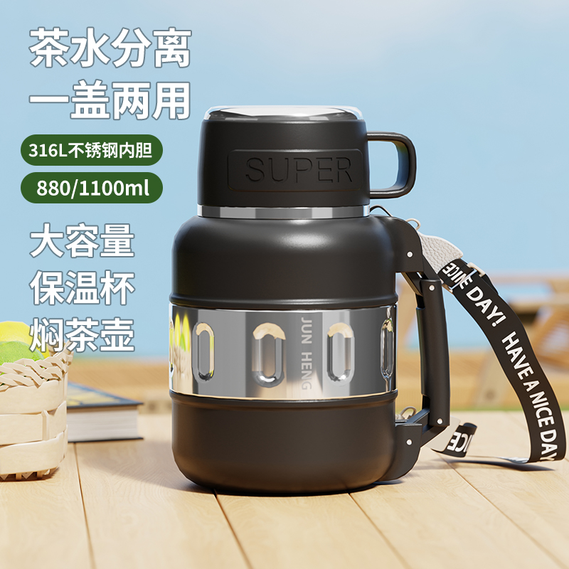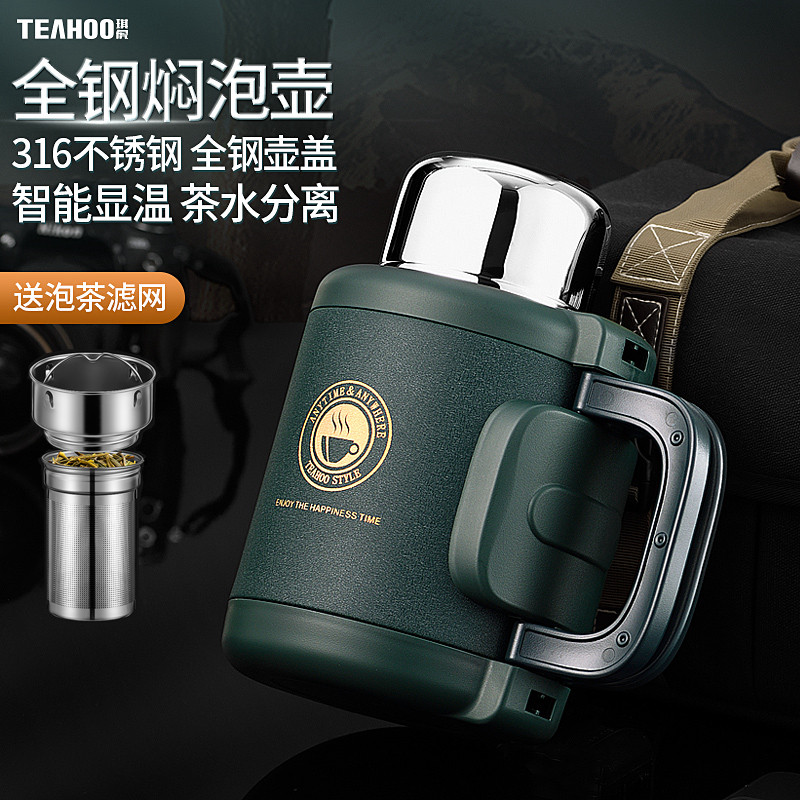 户外焖茶壶316不锈钢智能温显茶水分离背带便携车载焖泡保温水壶
