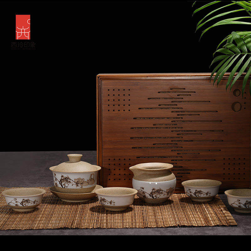 【西泠印社】玉映砂茶具高档紫砂茶杯竹制镂空茶盘礼盒套装送礼
