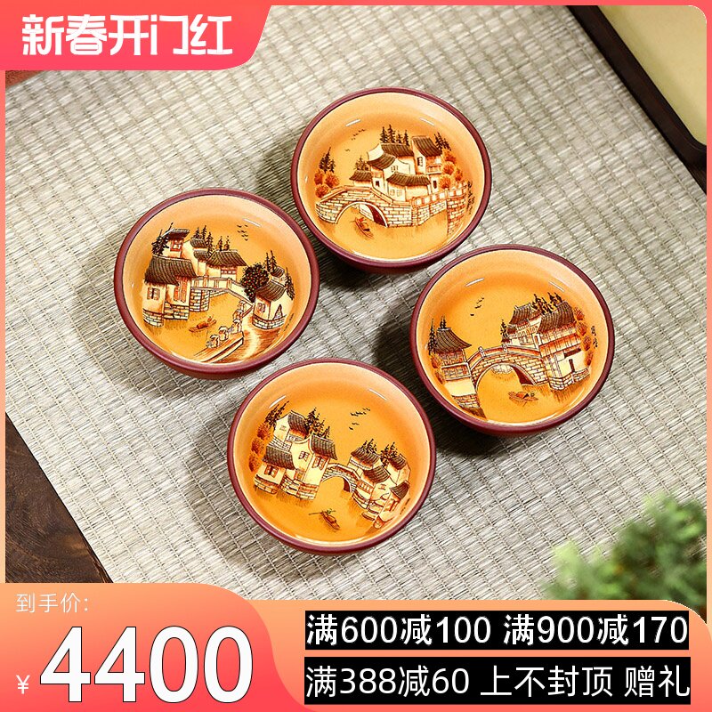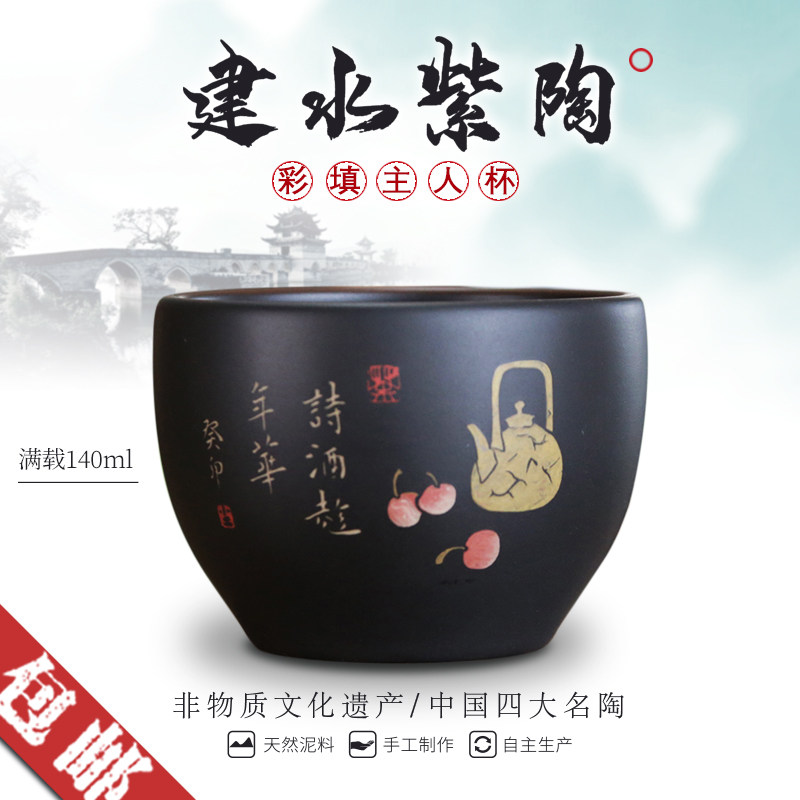 建水紫陶主人杯阴刻阳填手工打磨精品主人杯茶杯彩填主人杯小茶杯