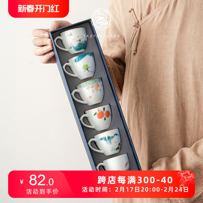 纯手绘主人杯套装功夫茶杯白瓷手柄杯子茶碗功夫茶具品茗杯礼盒装