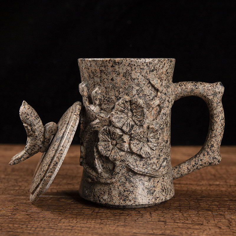 麦饭石杯子家用石雕茶杯浮雕杯摆件茶具男士水杯大容量父亲节礼物