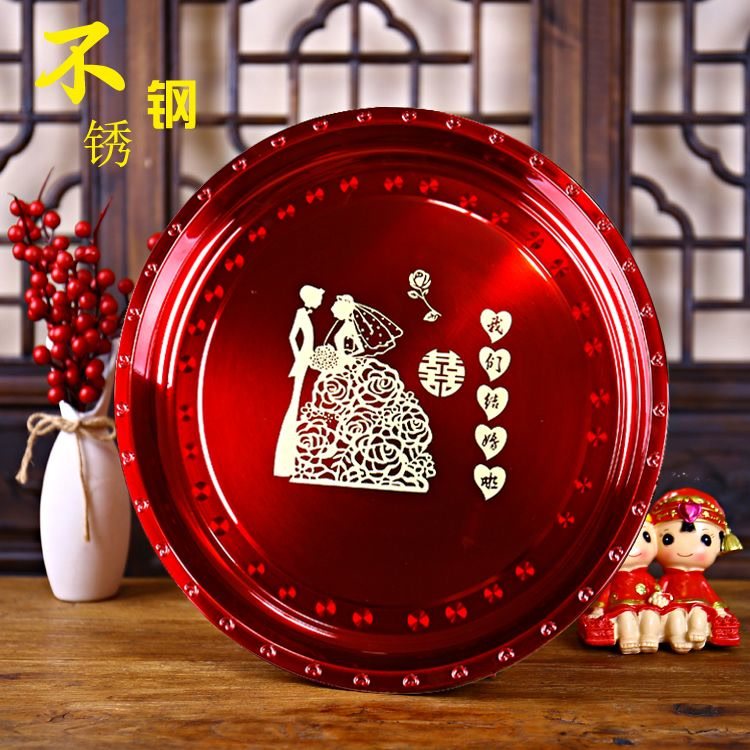 结婚托盘红色圆形喜盘不锈钢糖果盘茶盘子婚礼改口敬茶杯茶具套装