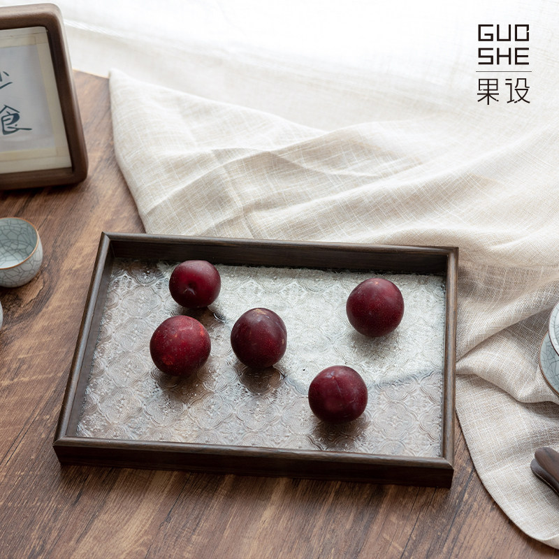 新品枝荫复古实木托盘黑胡桃木茶盘海棠花玻璃点心果盘Z长方形创