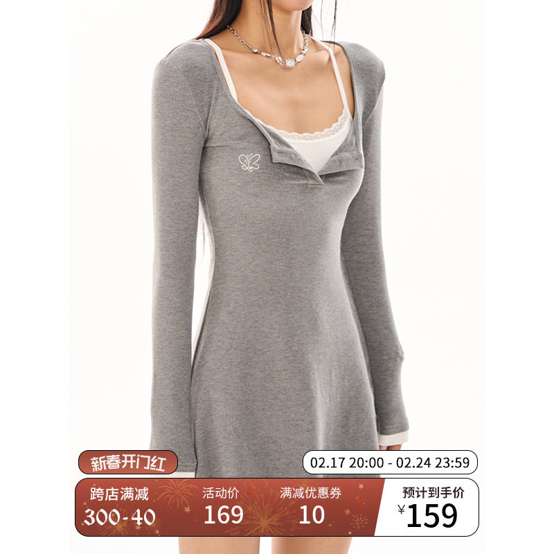 野生zerocircle裙子两件套女秋辣妹显瘦修身收腰灰色长袖连衣裙子