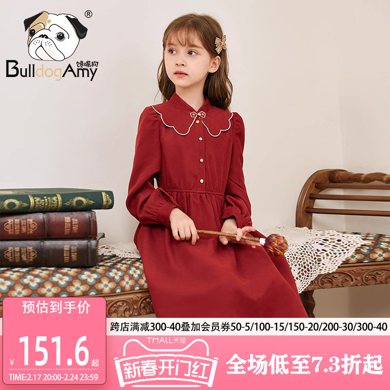 女童娃娃领连衣裙洋气秋季拜年服公主裙中大童灯芯绒红色裙子儿童