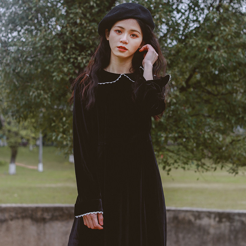 法国小众裙子新款复古文艺少女娃娃领减龄藏肉气质丝绒黑色连衣裙