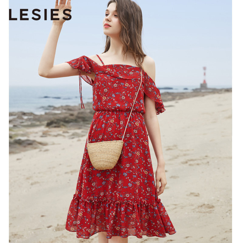 蓝色倾情夏装新款女装 吊带连衣裙红色雪纺仙女裙子清秋气质长裙