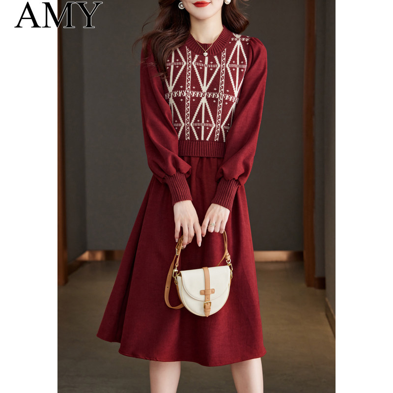 气质红色连衣裙女长袖2023秋冬季新款赫本风复古显瘦高级感红裙子