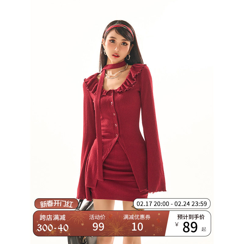 野生zerocircle红色针织套装女秋修身显瘦喇叭袖上衣包臀半身裙子