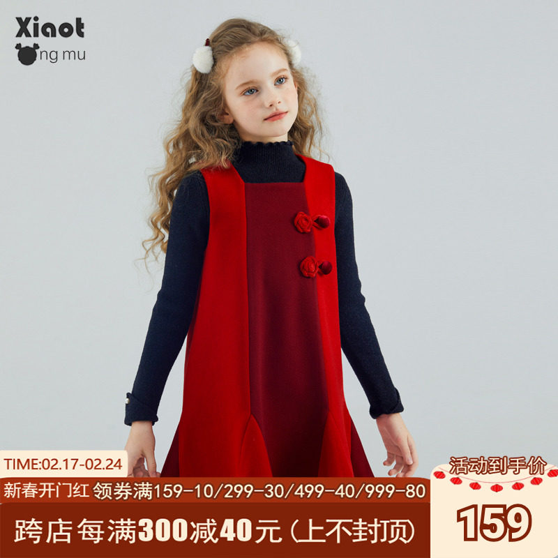 小童木 女童连衣裙秋冬新款洋气红色背心裙女大童毛呢a字公主裙子