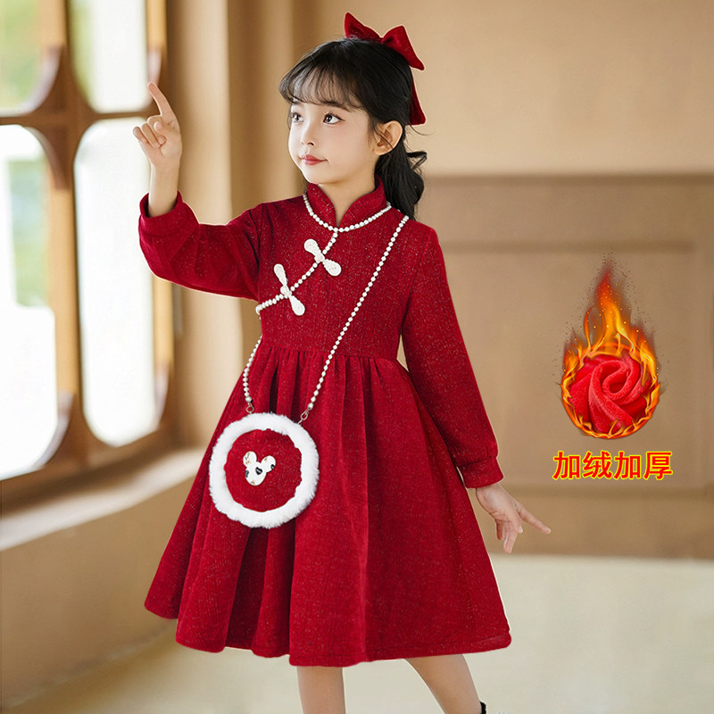 女童秋冬装连衣裙加绒2023新款红色女孩公主裙儿童装旗袍裙子冬季
