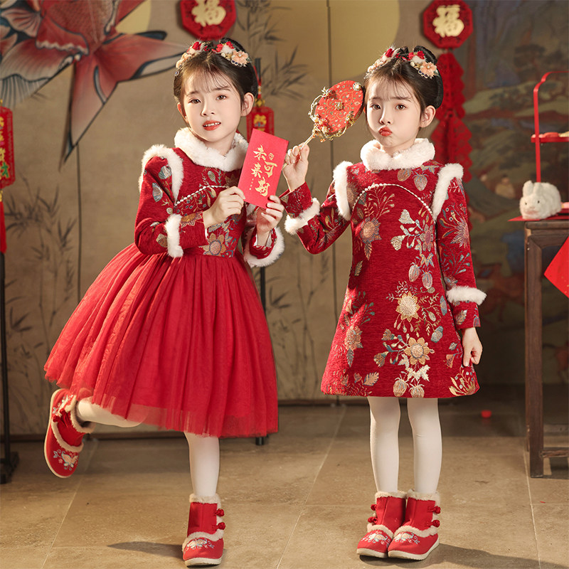 女童冬季连衣裙秋冬新款儿童红色裙子洋气旗袍拜年服女宝宝公主裙