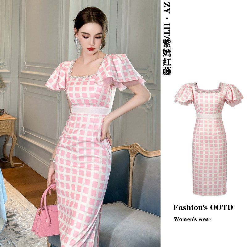 欧洲站时尚复古春装新款格纹收腰连衣裙中长款过膝气质优雅长裙子