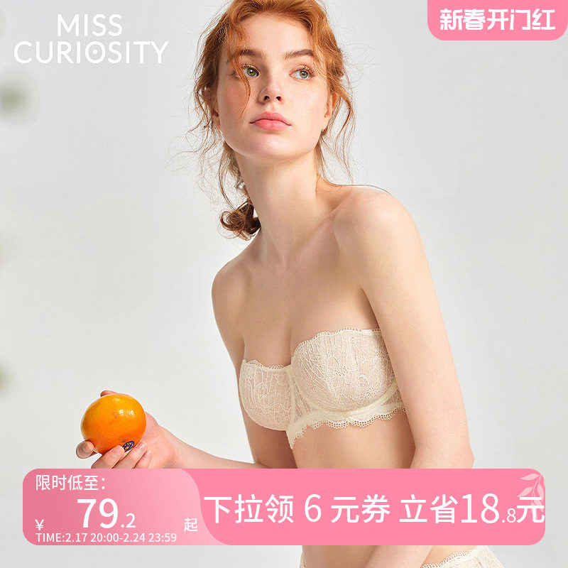 好奇蜜斯无肩带内衣女防滑抹胸蕾丝薄文胸罩套装大胸显小裹胸性感