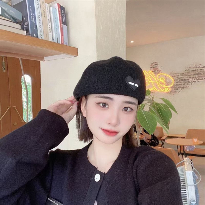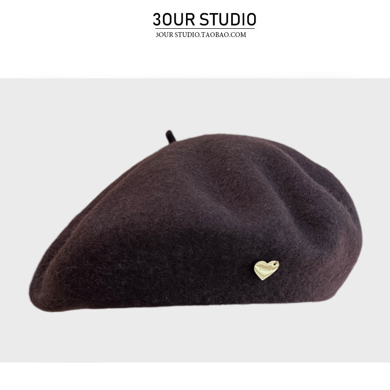 美拉德风棕咖色贝雷帽女秋冬羊毛呢ins韩版爱心小金标大头画家帽