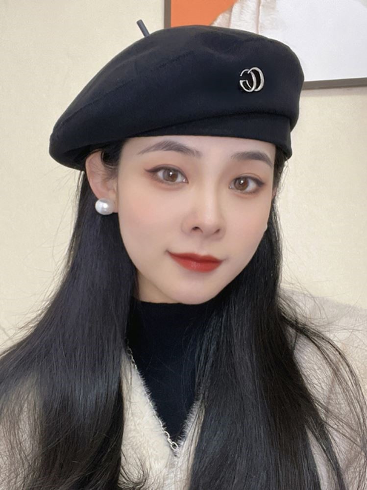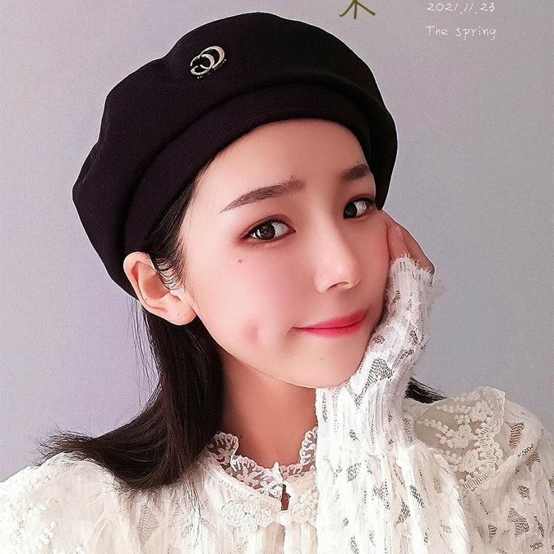 韩系ins毛呢贝雷帽子女2023新款秋冬百搭显脸小文艺金属标画家帽