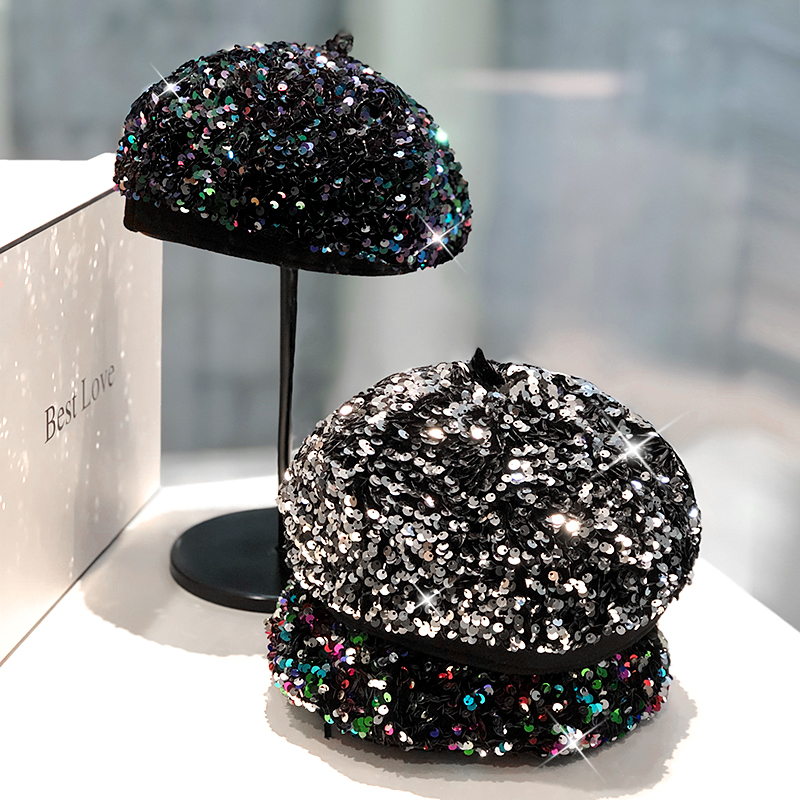韩版时尚网红亮片贝雷帽子女潮流欧美优雅个性2023新款八角画家帽