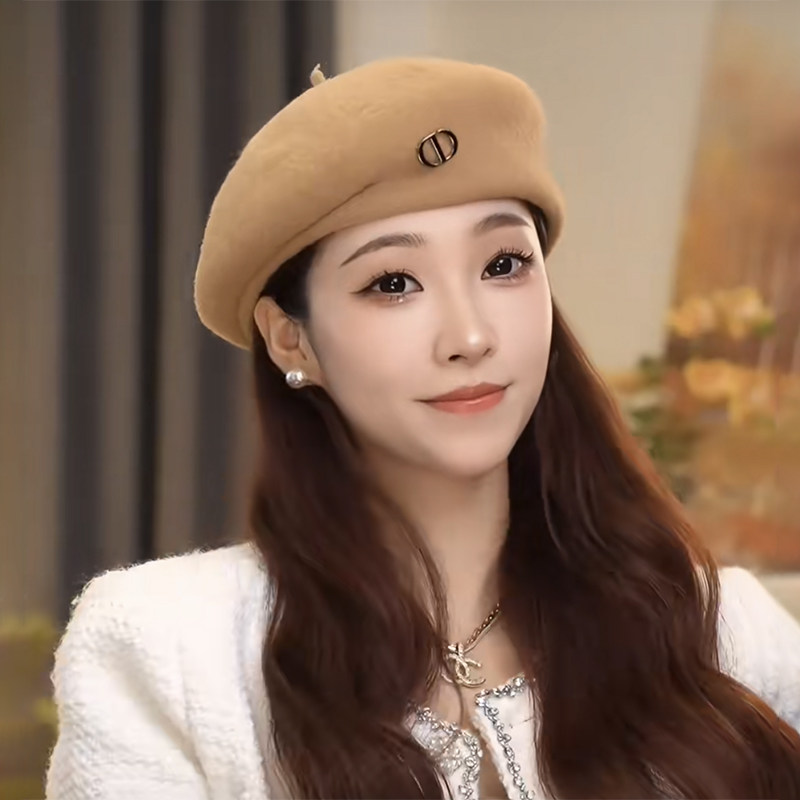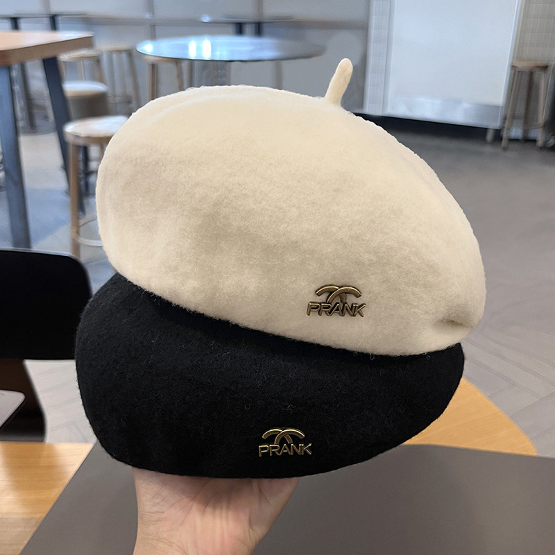 韩国fever同款~优质版金属B字母羊毛贝雷帽女冬季金色扣画家帽子